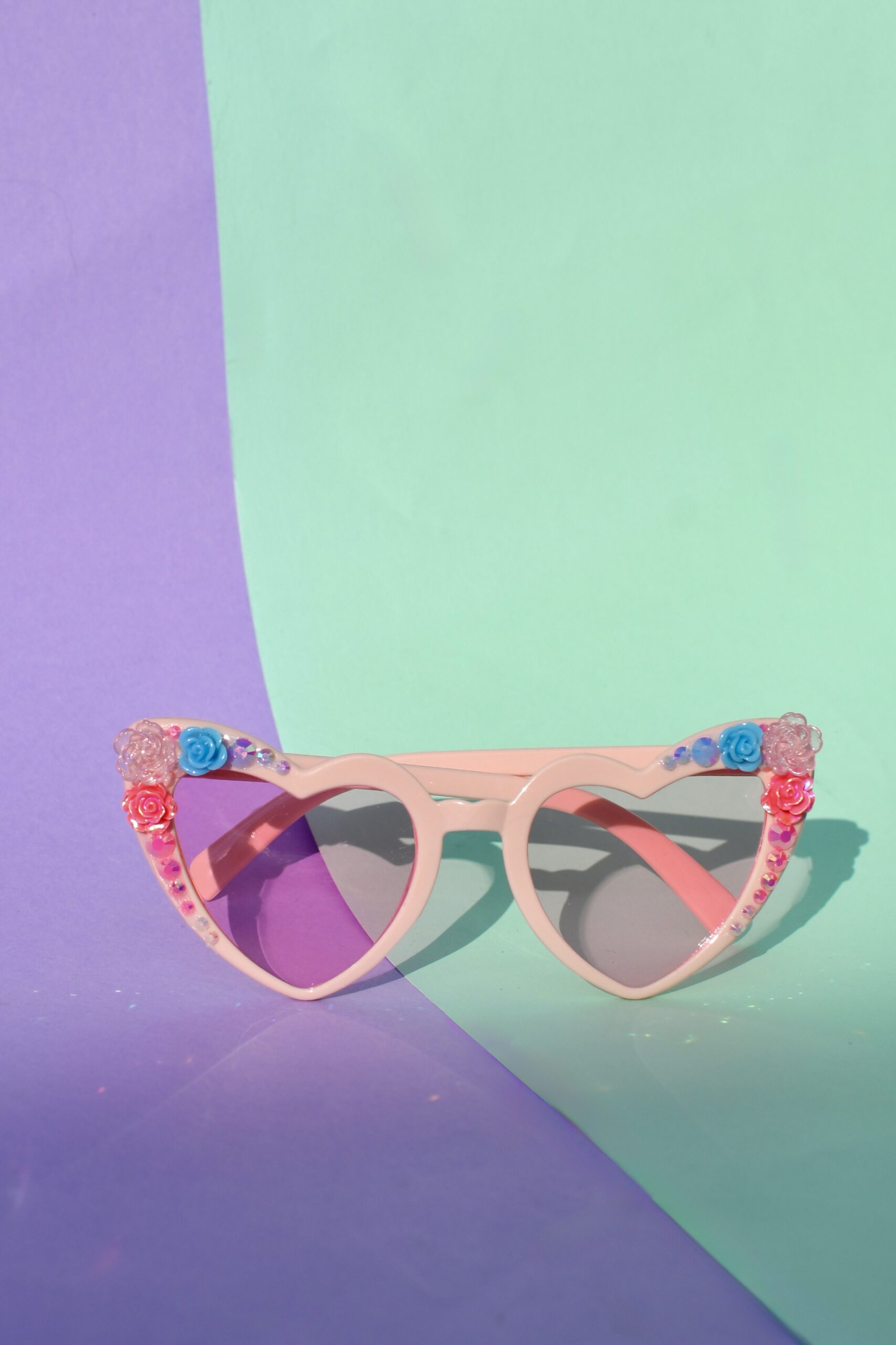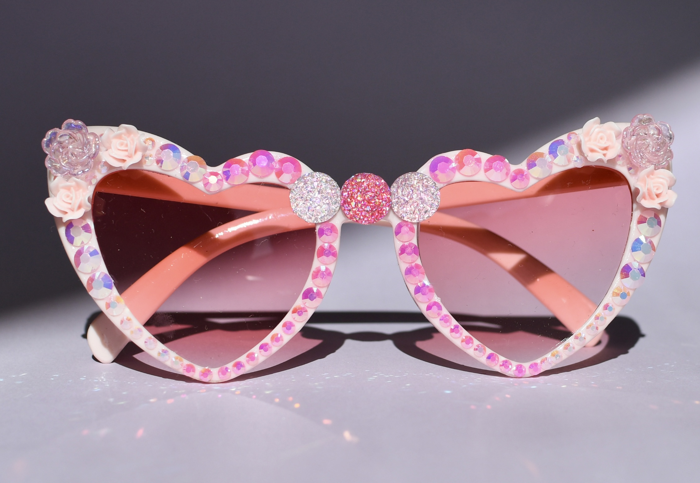 UUTUUS! Ihanat sydämen muotoiset aurinkolasit kääntävät varmasti katseet etkä häikäisty itsekkään! Kaikki koristeet on liimattu käsin, joten tuotteet ovat uniikkeja ja saattavat poiketa hieman kuvasta. Voit valita useasta erilaisesta mallista omasi. Leveys: 15cm, korkeus 6,5 cm, sangan pituus 14cm. Katso myös muut aurinkolasit täältä!