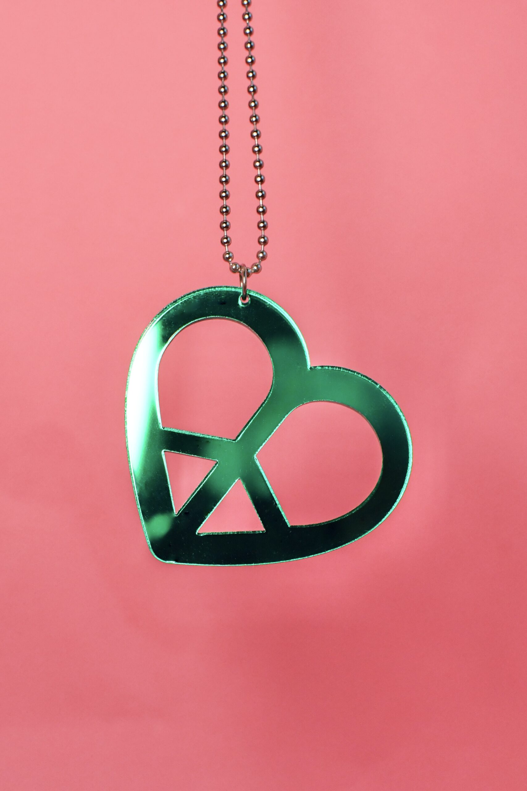 Ihana Peace Sydän saatavana nyt myös kaulakoruna useassa värissä: Iridescent, Hopea Peili, Pinkki Peili, Vihreä Peili sekä Hopea Glitter. Korun korkeus noin 6 cm, ketjun pituus 65cm-75cm. Saatavana myös korvakoruina!