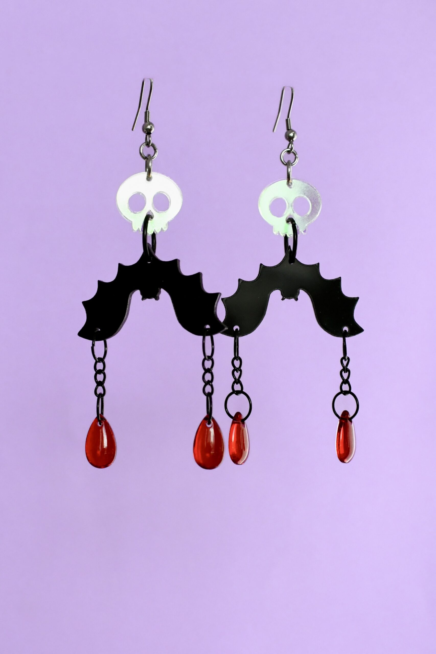Kummitteleva Lepakko korvakorut on suunniteltu asettumaan täydellisesti korvaan kehystämään kasvoja. Koruosat ovat ruostumatonta kirurginterästä, koukussa on tuplarengas, jonka ansiosta korvakorut kääntyvät aina eteenpäin kasvojen sivuilla.