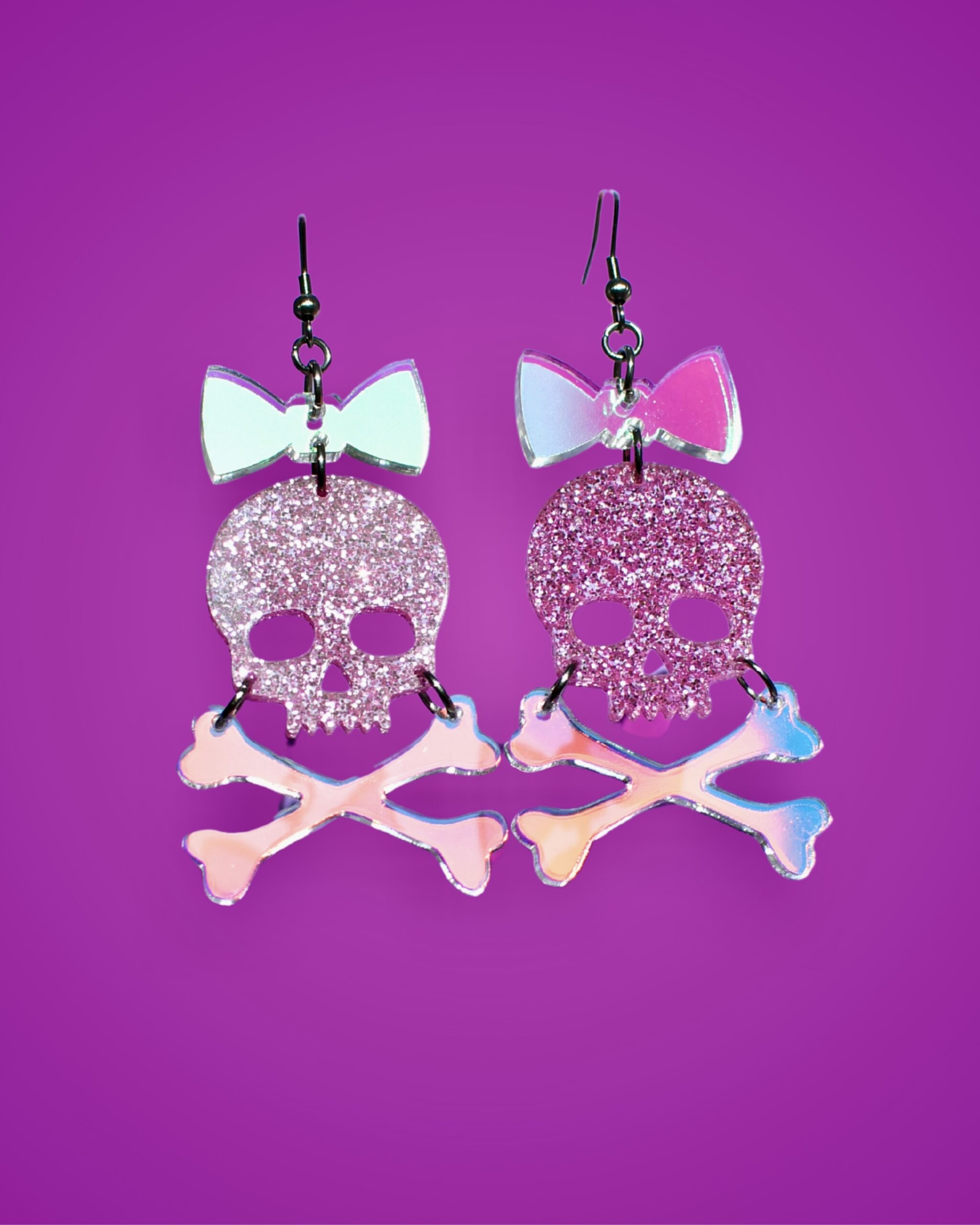 Kolmeosaiset Isot Pääkallo korvakorut ovat saatavana useassa sävyssä ja mallissa: liila glitter pääkallo + musta hattu päässä + mustat luut, liila glitter pääkallo + pinkki peili rusetti päässä + vaaleanpunainen glitter luut, musta pääkallo, musta glitter rusetti, liilat glitter luut, vaaleanpunainen glitter pääkallo + iridescent rusetti + iridescent luut.. Koruosat ovat ruostumatonta kirurginterästä, koukussa on tuplarengas, jonka ansiosta korvakorut kääntyvät aina eteenpäin kasvojen sivuilla.