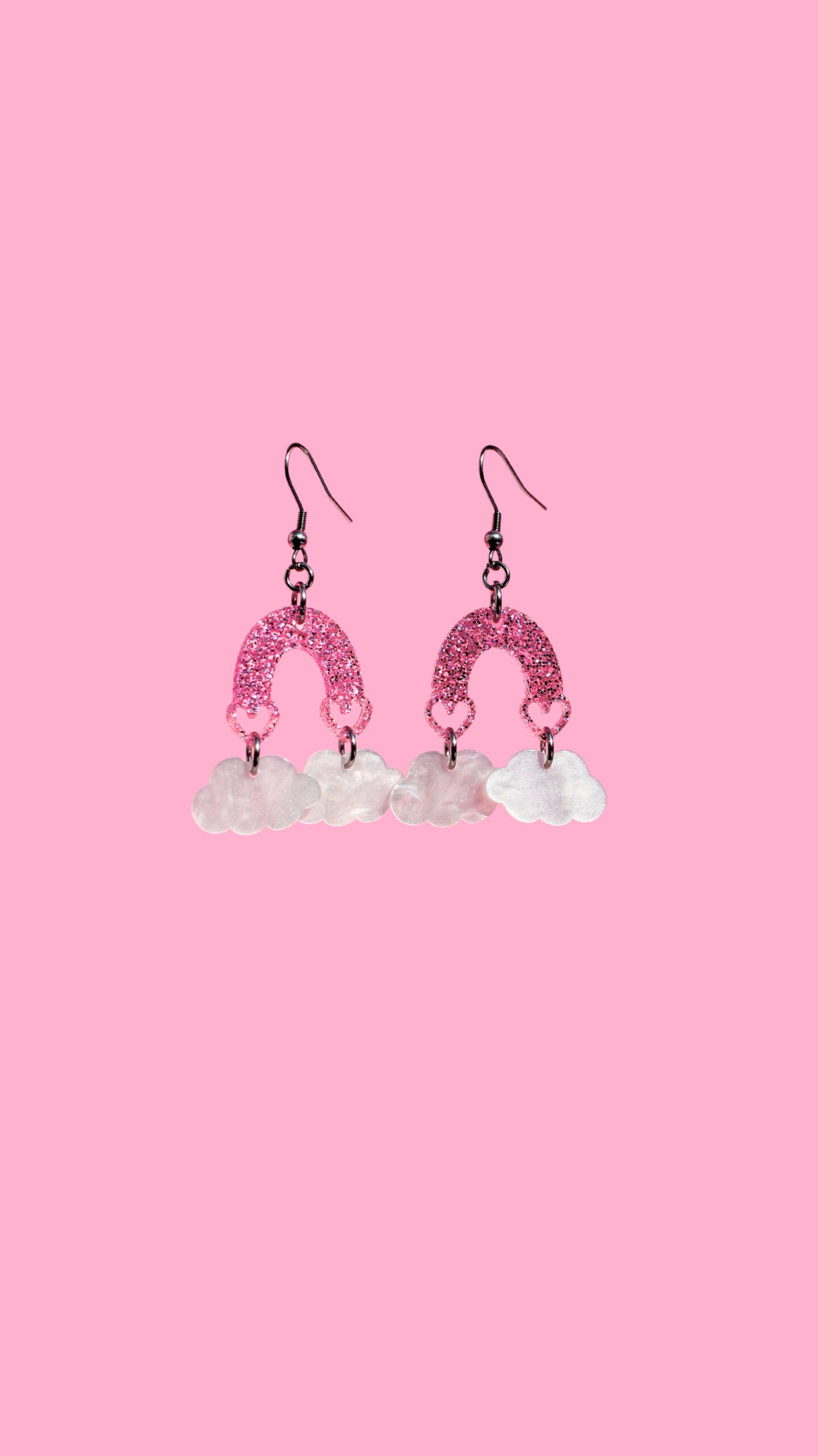 UUTUUS! LIMITED EDITION! Kauniit Sateenkaari korvakorut pilvellä ovat saatavana kahdessa sävyssä: vaaleanpunainen glitter sekä liila glitter. Koruoson kokonaiskorkeus on noin 3 cm, kokonaiskorkeus koukun kanssa noin 4,5 cm, paino vain 3 grammaa. Upea korvakoru liikkuu kauniisti korvassa. Katso myös muut uutuudet!
