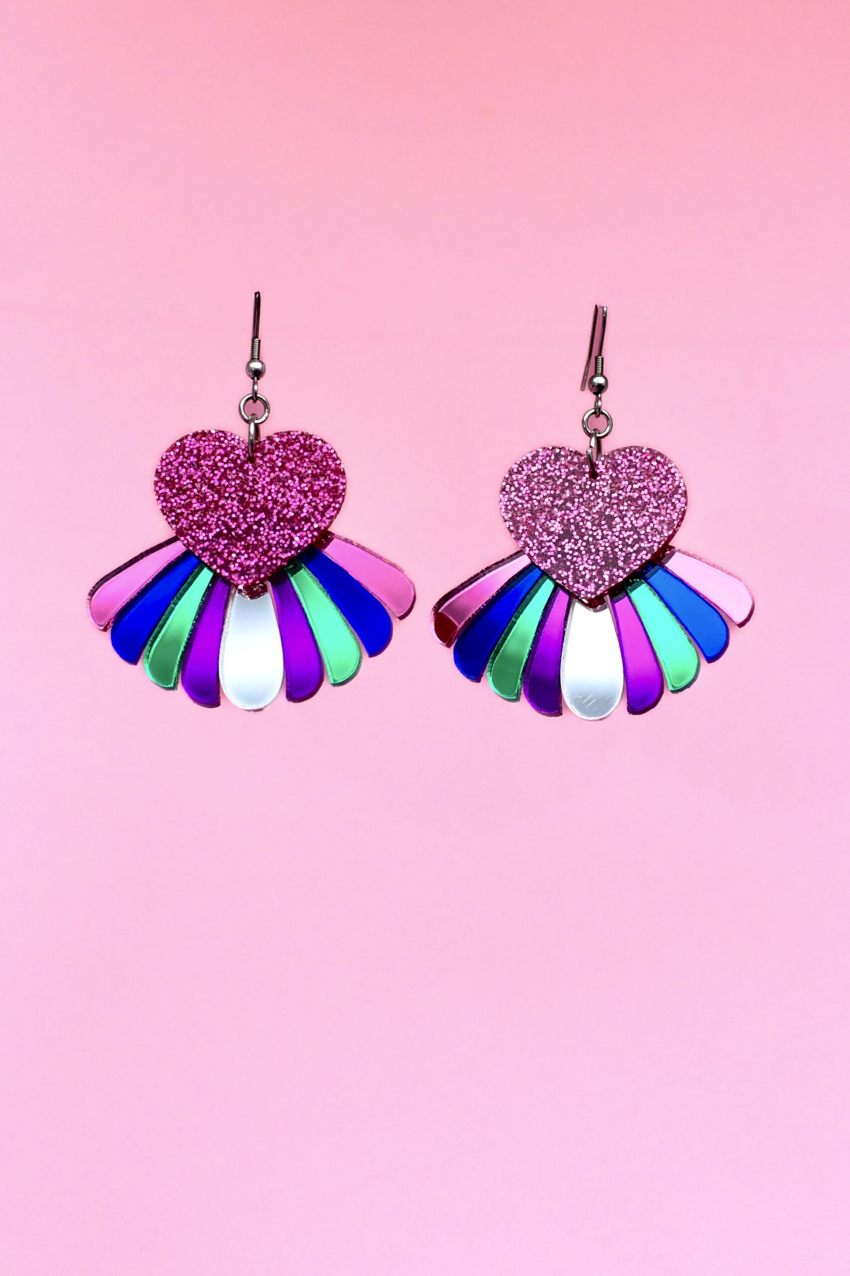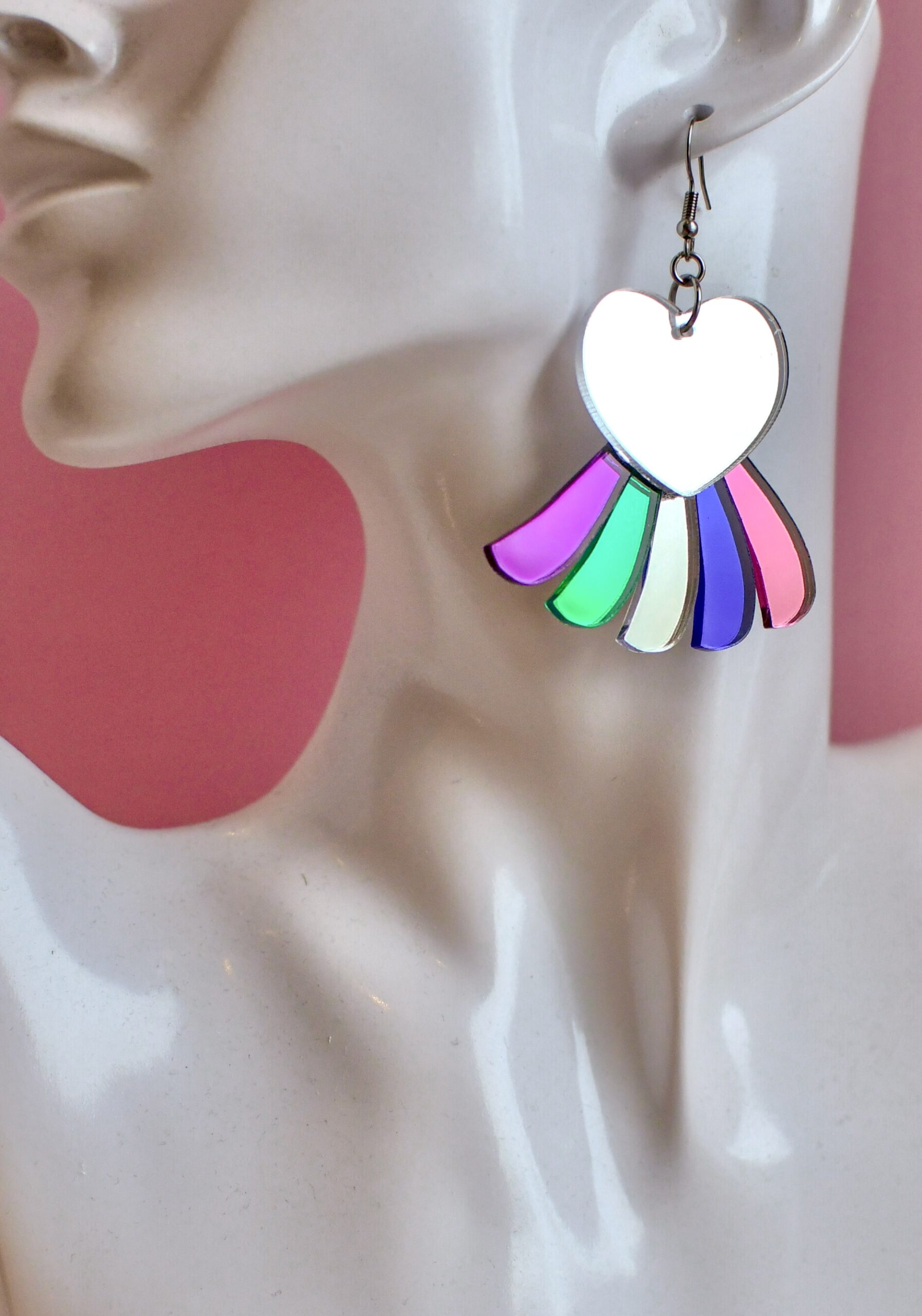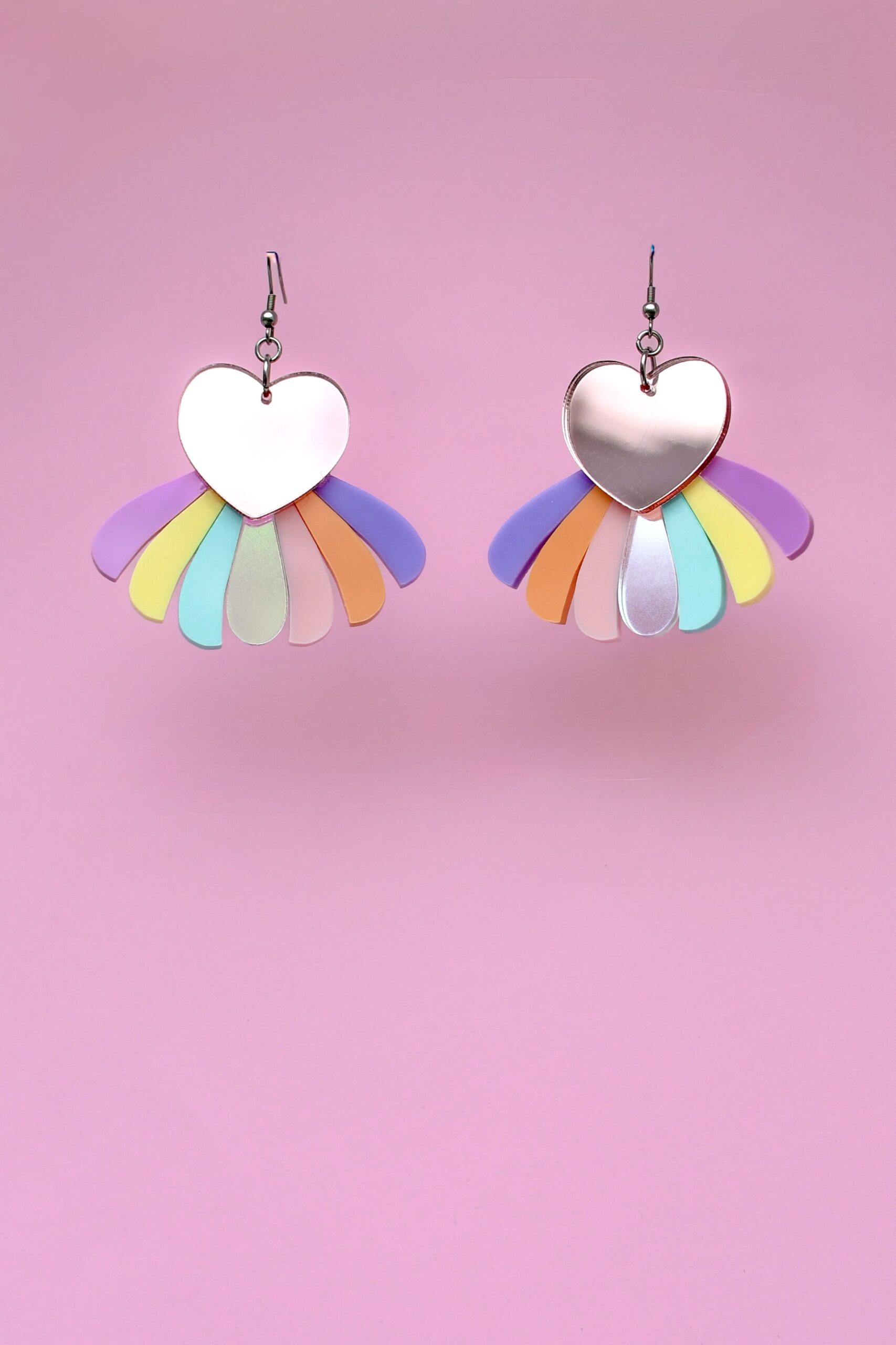 UUTUUS! LIMITED EDITION! Upeat RainbowHeart Korvakorut korvakorut saatavana nyt yhteensä neljässä sävyssä: ruusukulta peili, hopea peili, kulta peili sekä pinkki glitter. Koruosan korkeus 5cm, kokonaiskorkeus koukun tai renkaan kanssa on noin 6cm, paino vain 4-5 grammaa. Upea korvakoru liikkuu kauniisti korvassa ja koukussa on tuplarengas, joka kääntää korun aina eteenpäin korvassa. Katso myös muut uutuudet!