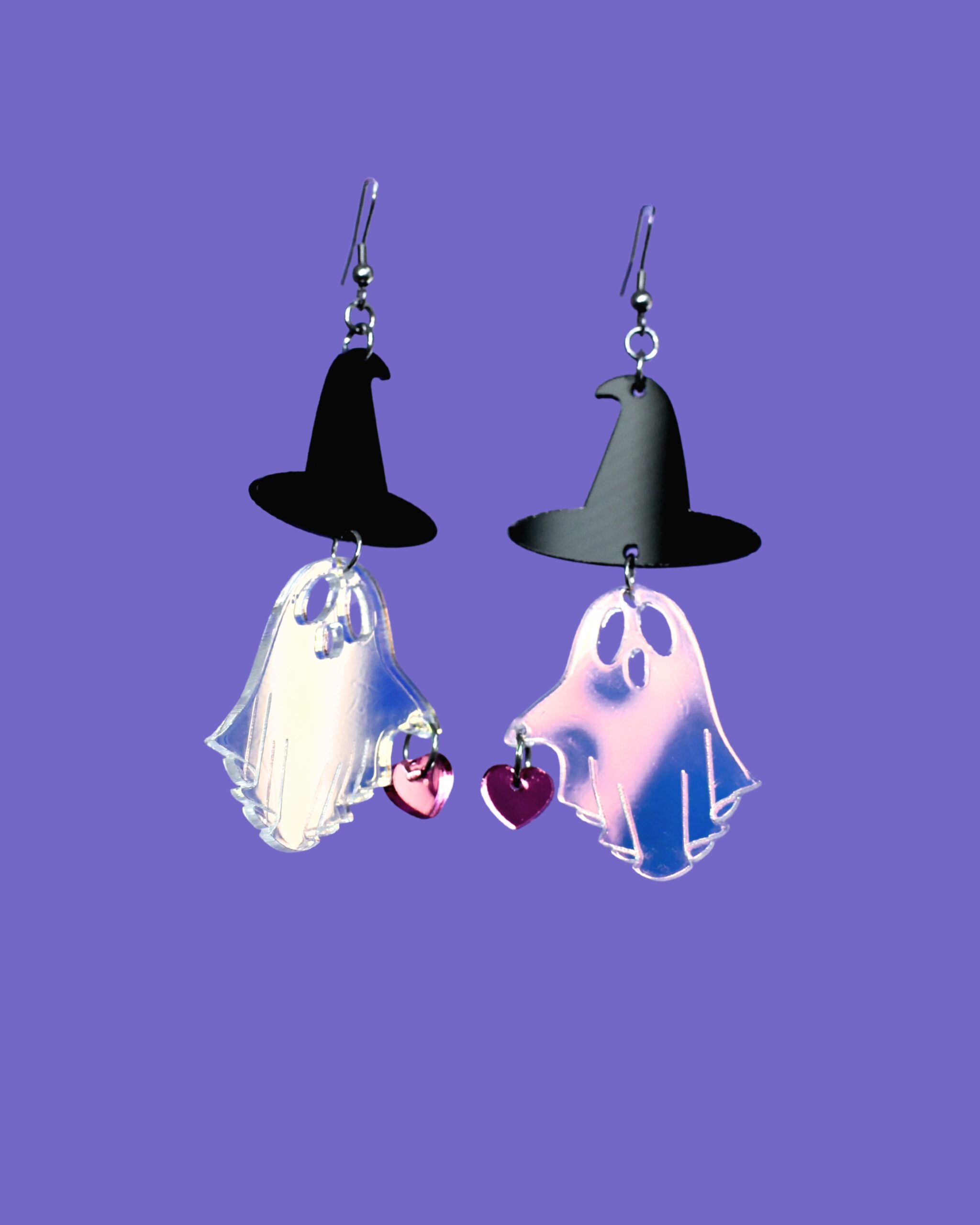UUTUUS! Näyttävät ja leikkisät Kummitus hatulla korvakorut ovat täydelliset Halloween faneille! iridescent kummitus on saatavana koukku ja rengaskiinnityksellä. Koruosan korkeus on noin 6,5 cm, korvakorun kokonaiskorkeus koukun kanssa on noin 8 cm, paino 4 grammaa. Katso myös muut limited editiom Halloween -korvakorut täältä!
